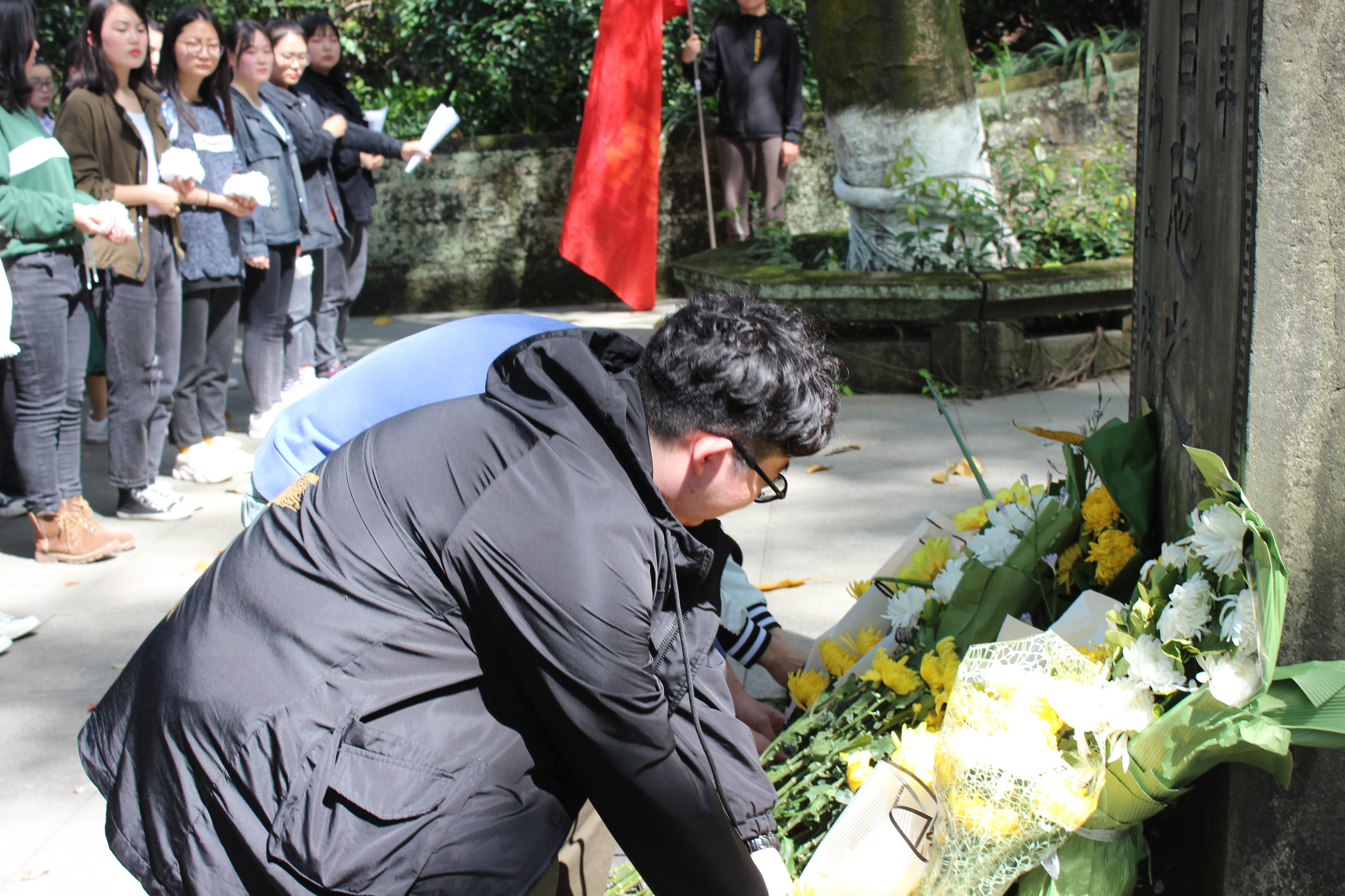 代表发言完毕,接下来主席团及部长代表、各班代表先后上前献花,献花完毕,集体默哀一分钟以缅怀张烈士。