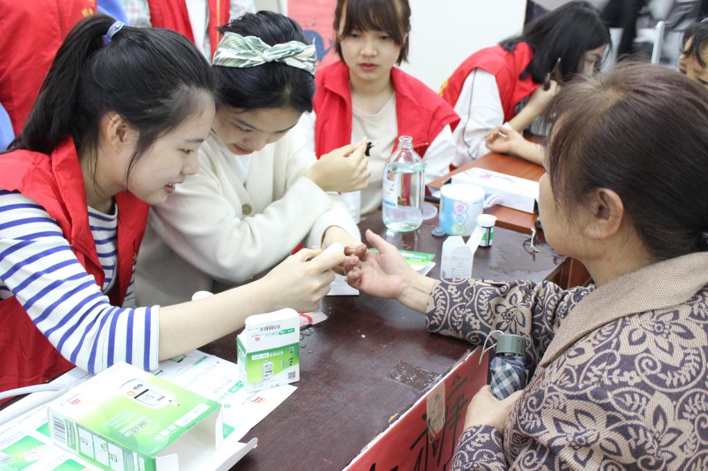 活动伊始,主持人同老人们分享了本次活动开展的背景,并详细地介绍了现场活动内容。随后,老人们便起身向自己感兴趣的板块走去。本次活动共设置了测血压血糖、免费义诊、旧药回收、情暖夕阳计划、养生药膳、有奖问答和义务画像七个板块。其中,测血压血糖处尤其热闹,志愿者给老人们测完血压血糖后,还细心叮嘱了一些生活中的注意事项。同时,志愿者也在免费发放香甜养胃的南瓜养生粥,在这个阴雨绵绵的上午给老人和小孩们及时送上了一份温暖。活动期间,也有部分志愿者冒雨到社区里发传单,以吸引更多的人前来参与本次活动。