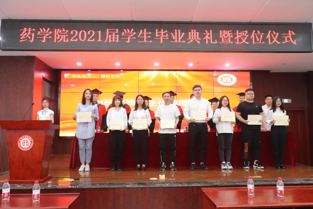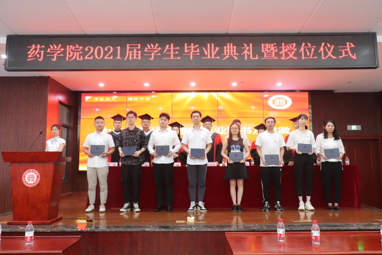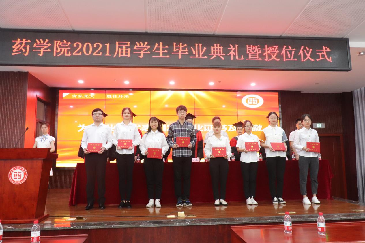 典礼在庄严的国歌声中拉开序幕。典礼上,陈敏副院长宣读《PA视讯集团关于准予2021年春季学期研究生毕业的决定》和《PA视讯集团关于准予2021届全日制普通本科学生毕(结)业的决定》。主席台学院领导和老师为毕业生代表颁发了毕业证书、学院团委专门为2021届毕业生定制的精美纪念品“一生荣药”的杯子及院徽,希望同学们感恩母校,追逐梦想,绽放青春,献身绿色的健康事业。