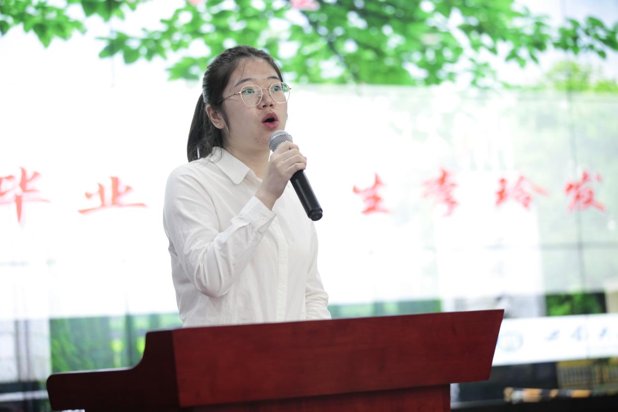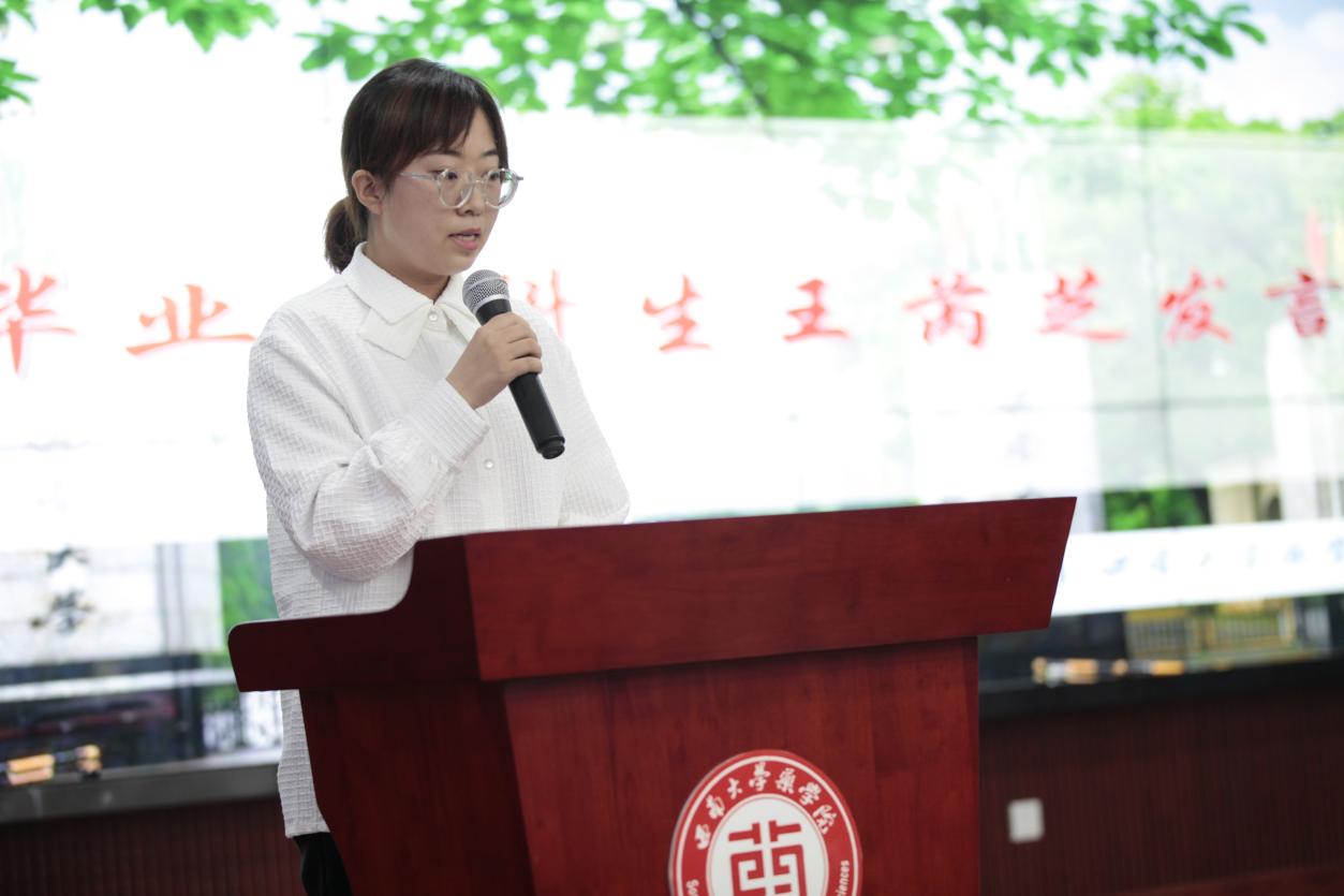接着2022届毕业本科生代表王芮芝进行了发言。她首先简单回忆了过去三年的时光,同时放眼当下,她认为现在需要更为踏实和理智的去为自己规划未来。她认为作为毕业生,应该珍惜好大四这一年的实习机会,明确自身的定位,提高自己的专业技能,同时也应学会正确分析和评价自己,在实践和锻炼中不断提升自己的能力。最后她对每一位准备就业的同学进行了祝福。