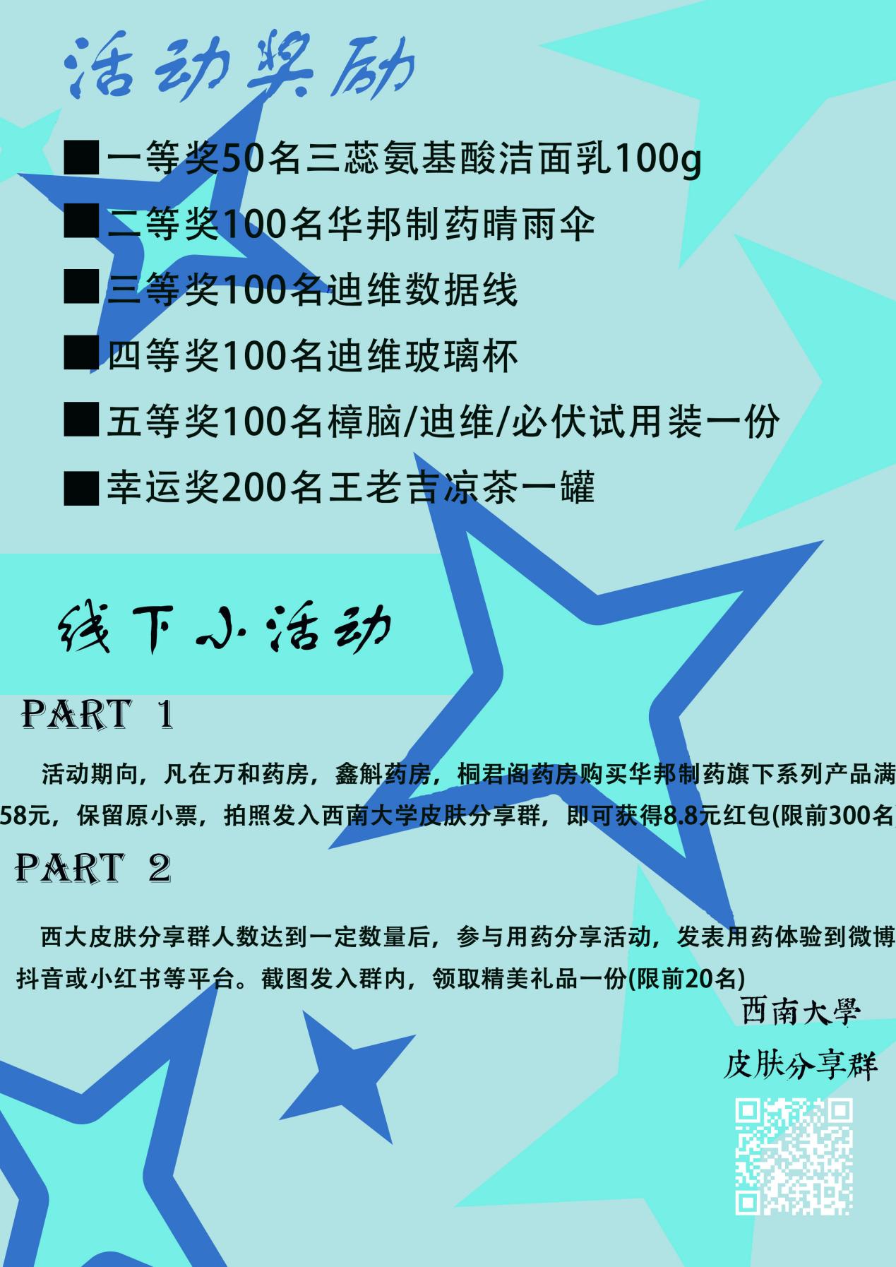 活动三:活动期间(10.21-11.30),凡在指定连锁药店(仅限万和药房、鑫斛药房、桐君阁药房)购买华邦制药产品超过58元且留有原始小票,拍照发至PA视讯集团皮肤分享群,即可在群内找相关工作人员领取8.8元现金红包。使用华邦制药产品后,在任一公众平台发布用药前后对比,截图发至群内相关工作人员处,还可领取精美礼品。