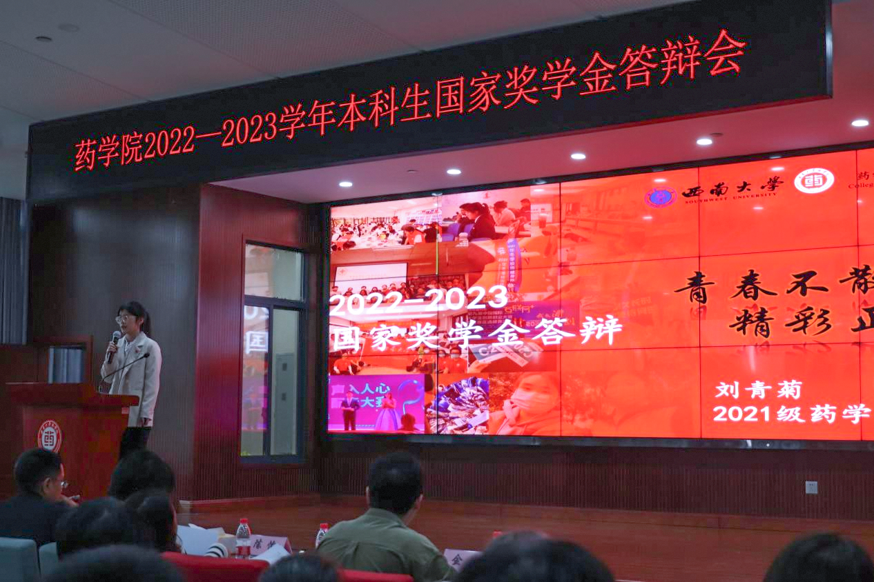 为激励学子勤奋好学、刻苦钻研,发挥优秀学子的模范引领作用,营造创优争先的良好学风环境,近期,学院在B113报告厅举行了2022—2023学年本科生国家奖学金答辩会。学院党委副书记杨坚、副院长张保顺、药学专业负责人李春梅教授、硕士生导师陈怡教授、团委书记肖媛媛、辅导员陈雪梅、金达出席答辩会并担任评委,2023级全体本科生到会观摩学习。