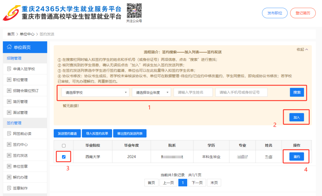 4.核对查找到的学生信息,确认无误后点击“加入”将该生加入签约发送列表。