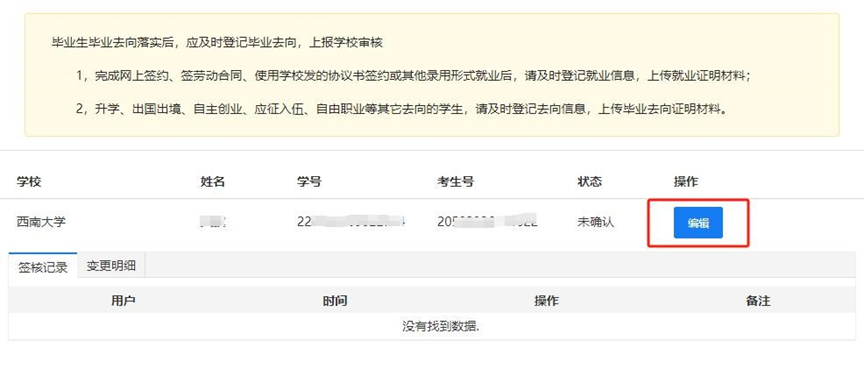 其他去向登记:升学、出国(境)、入伍、自主创业、自由职业等其他就业形式,使用此项。先找到个人信息,点击“编辑”,进入就业登记界面。
