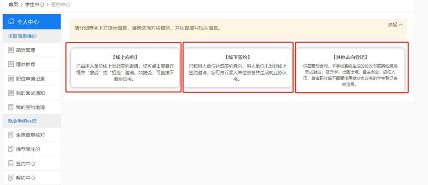 3.根据个人就业实际情况,分别选择“线上应约”、“线下 签约”、“其他去向登记”。