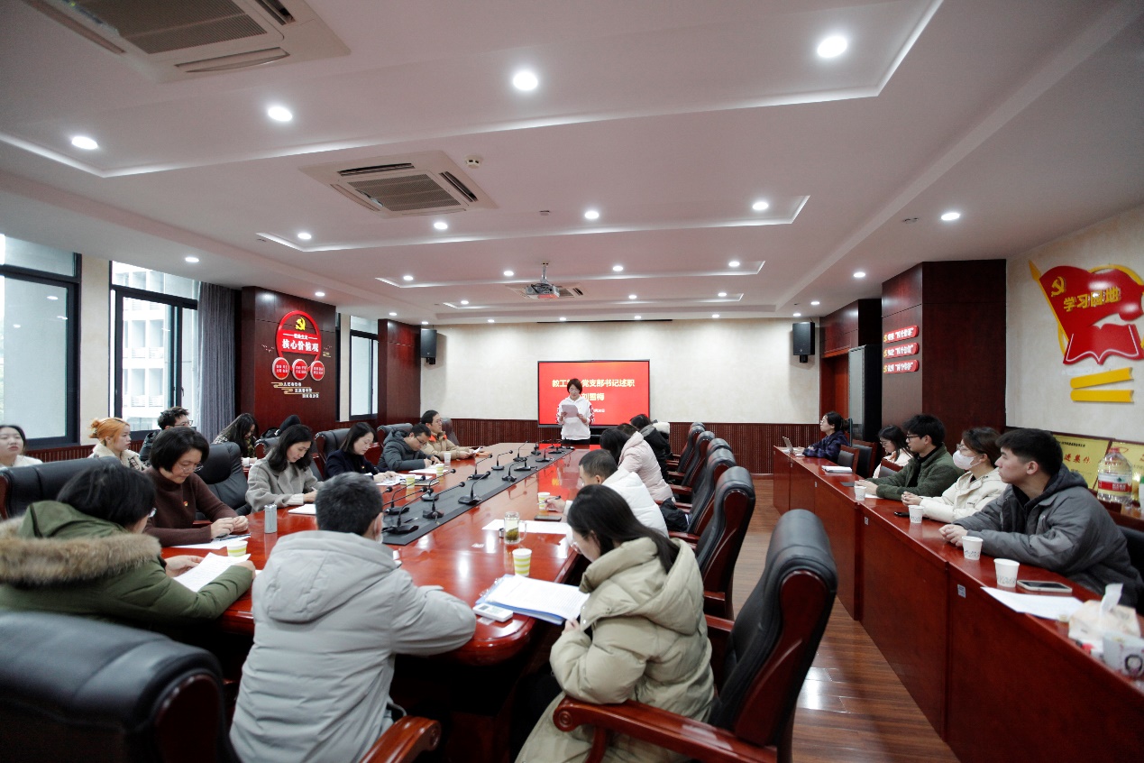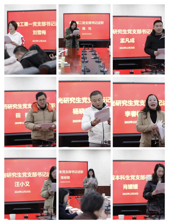 本次述职大会严格按照学校《关于开展2023年度党组织书记抓基层党建述职评议考核工作的通知》要求,采用“一述一评”的方式。会上,学院9位党支部书记围绕2023年的履职情况、存在的突出问题以及下一步的打算措施等评议考核重点内容进行述职。陈敏书记对各支部书记述职情况进行了一一点评,并就支部如何探索党建与科研的有机融合、加强党员队伍政治引领、如何发挥党员的先锋模范带头作用、凝练党建品牌特色,推进“一支部一品牌”建设等工作进行了指导。学院党委委员、纪委委员根据日常工作检查和评议考核重点内容对各支部的述职进行打分评级。