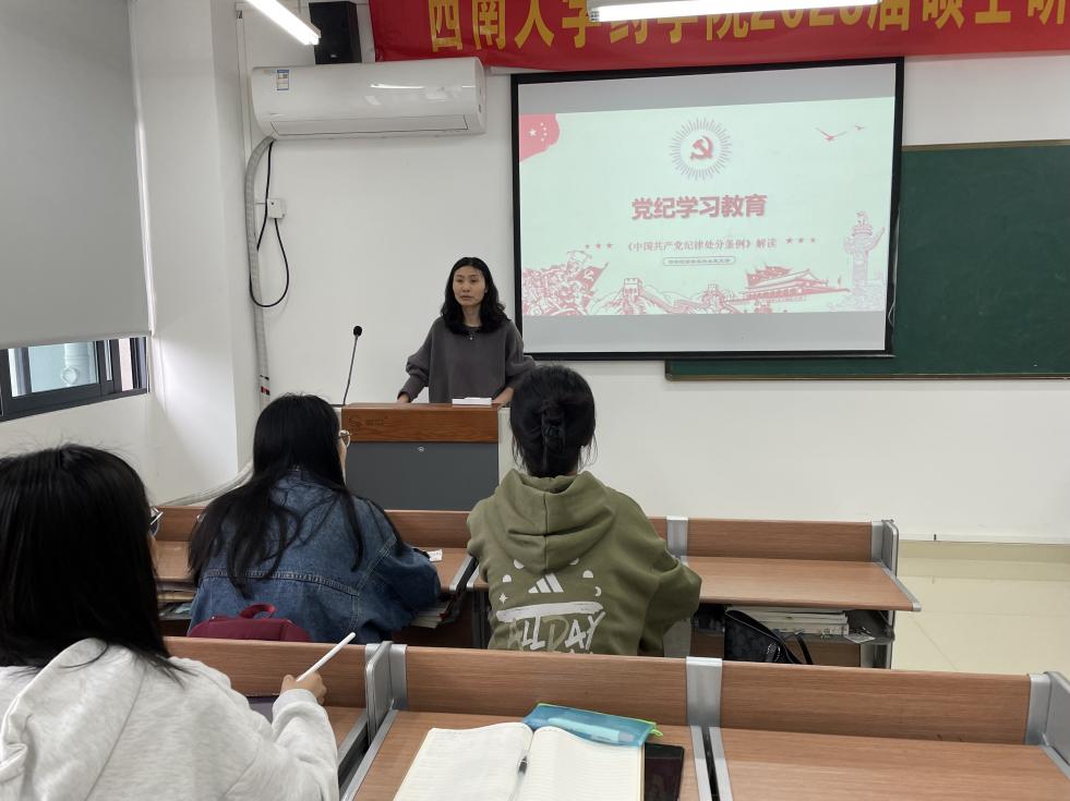 为深入学习贯彻习近平总书记关于党纪学习教育的重要讲话和重要指示精神,引导广大党员干部学纪、知纪、明纪、守纪,自觉用党规党纪校正思想和行动,药学本科生党支部于4月25日在PA视讯集团1005教室开展了党纪学习教育专题组织生活会——学习《中国共产党纪律处分条例》(以下简称《条例》)。本次学习由支部书记陈裕容主讲,药学本科生党支部全体党员参与学习。