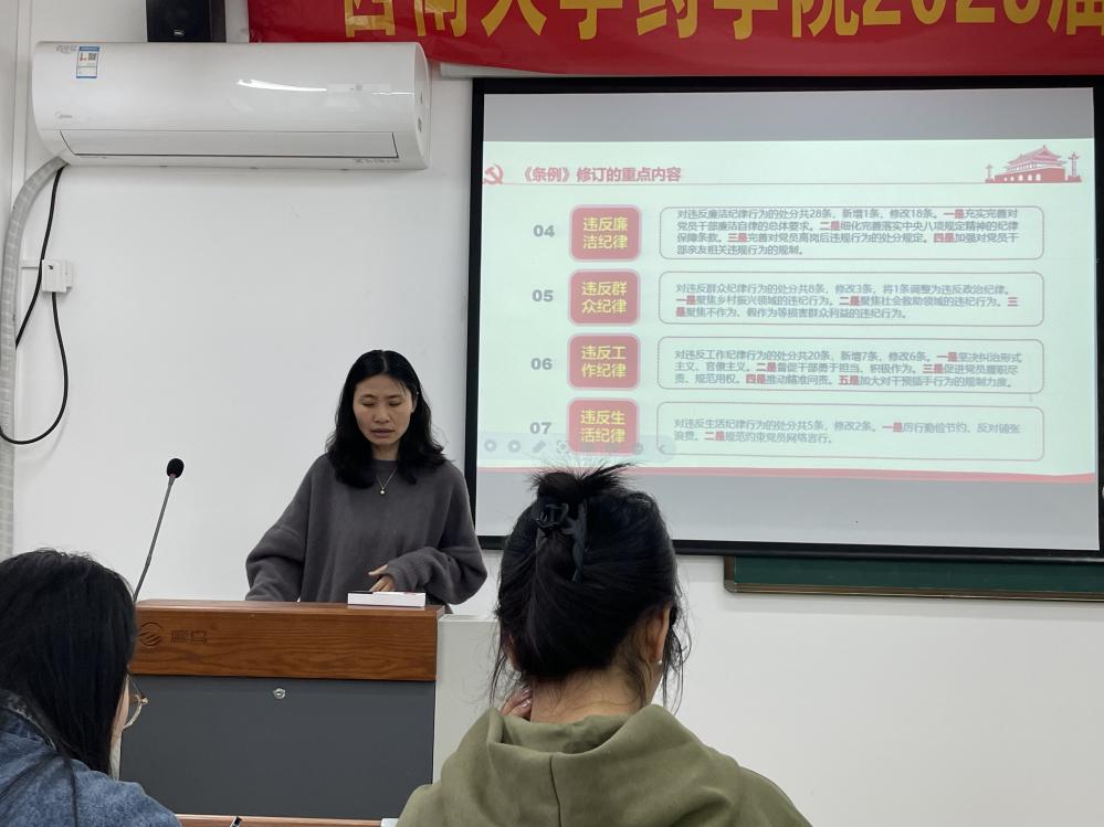 知敬畏、存畏惧、讲纪律、守规矩,《条例》的修订和实施,对于全面从严治党、推进党的自我革命具有重大意义。此次学习活动不仅让支部党员深刻领会了《条例》的重点内容,也增强了大家的党性修养和组织观念。药学本科生党支部将持续引导支部成员把遵规守纪铭刻在心,并转化为政治自觉、思想自觉和行动自觉,确保党的路线方针政策得到贯彻执行,为推动支部工作、落实立德树人根本任务贡献力量。
