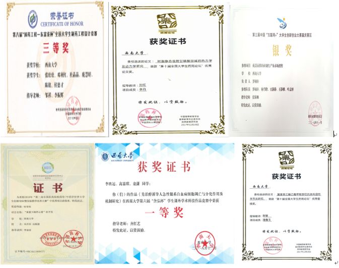 学院本科学生在医药院校世界大学生创新创业暨实验教学改革大赛、“挑战杯”、“全国大学生药苑论坛”、“全国大学生制药工程设计竞赛”等全国性大赛中获特等奖、一、二、三等奖共30余项;本科学生发表论科研论文40多篇。