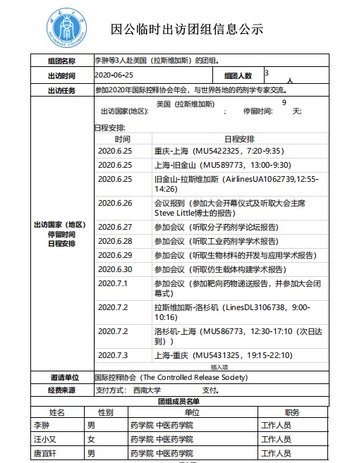 李翀 汪小又 唐宜轩因公临时出访团组信息公示
