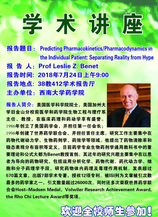 2018年7月24日美国医学科学院Leslie Z.Benet 院士来我院做学术报告