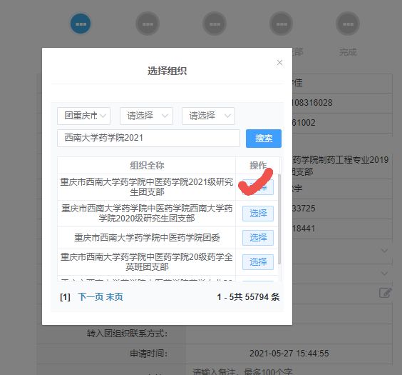 2、请拟录取同学登录“智慧团建”系统,转入团组织选择第1个PA视讯集团PA视讯集团中医PA视讯集团2021级研究生团支部即可(如下图所示)。