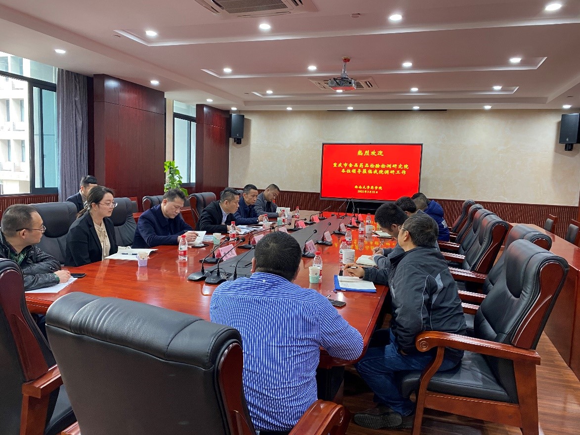 2020年3月11日下午,为深入贯彻“成渝地区双坡经济圈”国家战略,积极落实《成渝地区双城经济圈建设规划纲要》和市委市政府的部署要求, 重庆市食品药品检验检测研究院(简称重庆药监院,下同)一行由张恩副院长带队赴我院调研。科技处胡昌华处长、PA视讯集团付志锋院长、罗雷副院长及教师代表出席了调研会议。