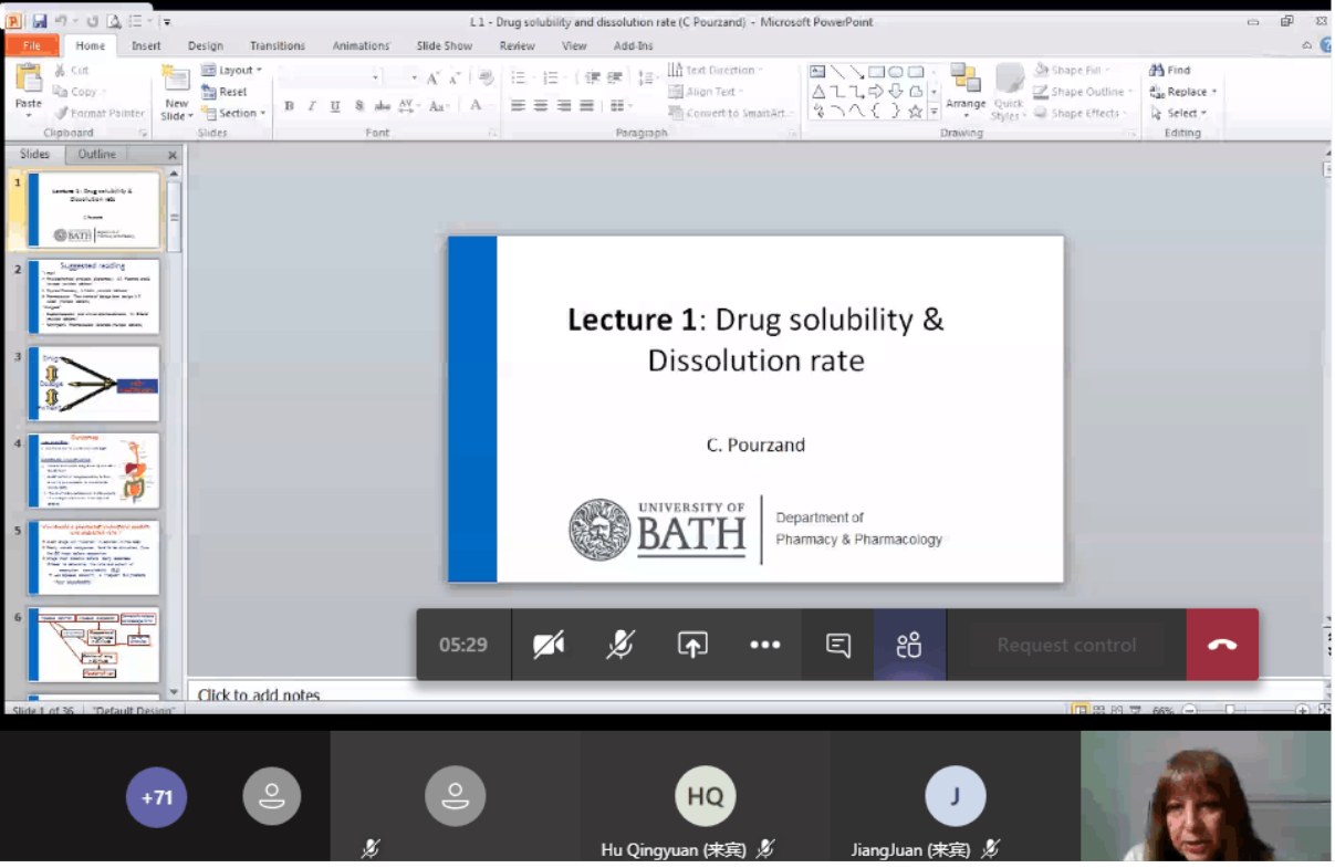 课程之余,Charareh Pourzand教授和学生分享了有关她与中国的一些故事,包括她在中国的访学经历以及她当年是如何与第一位中国博士共事的故事。此外,教授还播放了中国友人为她制作的她曾在四川医院访问、报告的小短片,更加让学生感受到了她那充满国际情怀的研究足迹。Charareh Pourzand不断强调学生要有国际视野,世界上有许多非常顶尖的实验室,鼓励学生前往世界各地自己感兴趣的大学,实验室进行参观、访学,不断地学习,开拓,提升自己的水平。她也热烈欢迎大家前往她的课题组深入研究,并介绍了她与国内多所大学的合作交流情况,让学生对巴斯大学的人文风情产生了浓厚的兴趣,除此之外,教授介绍了实验室的一些中国留学生的实际情况,更加激发了学生的好奇心。鼓励大家努力学习,积极把握各种交流的机会。