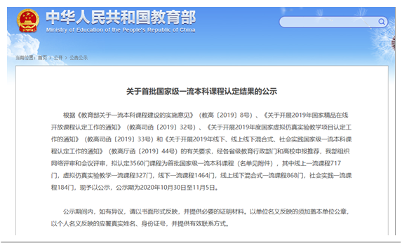 本次国家级一流本科课程认定工作,经各省级教育行政部门和高校申报推荐,国家教育部组织网络评审和会议评审,共认定3560门课程为首批国家级一流本科课程,其中线上一流课程717门,虚拟仿真实验教学一流课程327门,线下一流课程1464门,线上线下混合式一流课程868门,社会实践一流课程184门。《生物技术药物学》课程入选的是线下一流课程,成为PA视讯集团被认定为国家级线下一流本科课程的10门课程之一。
