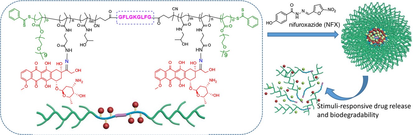 近年来,随着肿瘤发生机制研究的深入,肿瘤微环境敏感的靶向系统成为靶向药物递送的研究热点。基于聚合物前药的靶向递药系统,融合了前药和纳米药物的优势,不仅改善药物载量,增强稳定性,减少毒副作用,而且通过内吞作用获得较高细胞摄取率。不同于以往合成可电离的聚合物在低pH响应的方法,罗雷副教授课题组构建了刺激响应性聚合物前药,通过在药物分子和聚合物载体之间键合对酸不稳定的基团,触发抗肿瘤药物在肿瘤酸性环境中释放,实现对肿瘤的靶向给药。此外,通过GFLG(聚合物)连接药物和载体,使其对酶具有敏感性,可被溶酶体中组织蛋白酶B裂解,可加速递药系统中药物的释放。通过该刺激响应性聚合物前药胶束递送DOX(阿霉素)和NFX(硝呋齐特),提高了这两种药物的溶解性,增强了抗肿瘤药物在肿瘤部位的聚集,并利用药物之间的协同效应,有效抑制了乳腺癌的肺转移。
