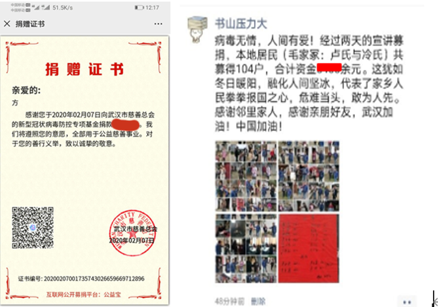 2017级研究生卢春松同学在家乡传播防疫知识,组织当地村民为武汉募捐,并协助当地村干部宣传疫情,记录村民身体情况。王丽、张乐、苗月、林利欣、史荷凤、孔柳欢、尹佳艺等46名同学纷纷捐款,奉献自己的一份爱心。