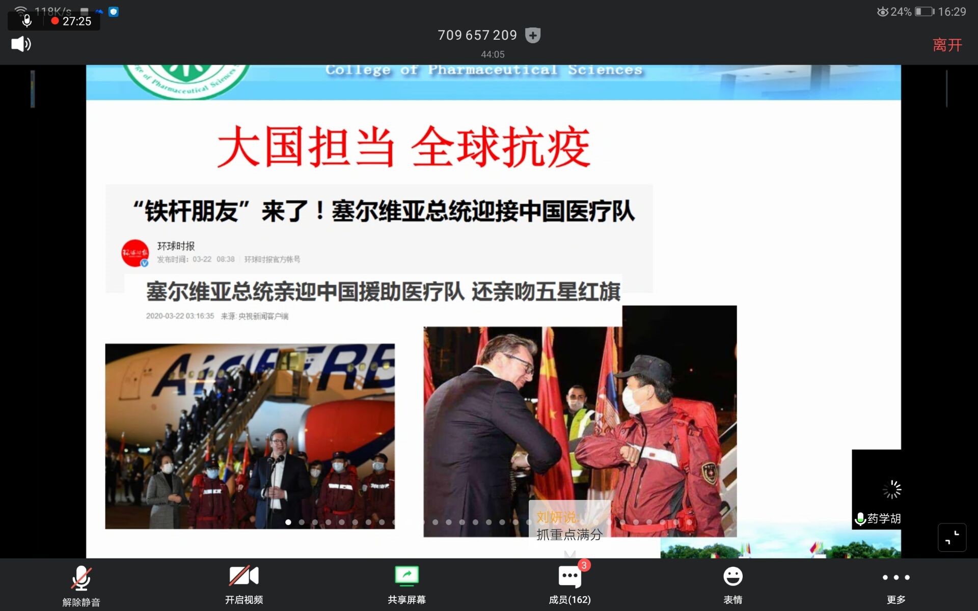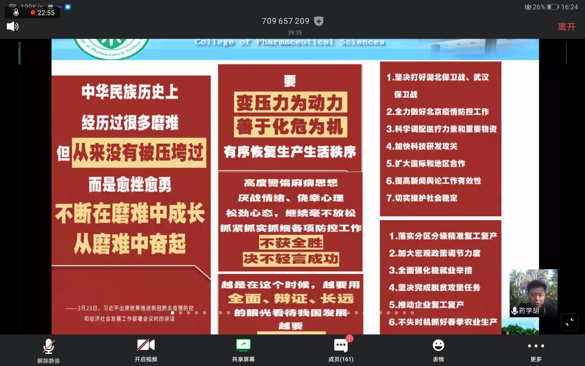 第一部分,胡院长向我们介绍了新冠病毒的特征,传播方式,灭活途径,并且贴心的提醒我们即使不能出门,也要注意锻炼,增强免疫力。同时他对这场疫情做了回顾和总结,这次疫情爆发的很突然也很迅猛,但中国不仅在短短两个月内基本控制住了疫情,还能向其他的国家伸出援手,他说作为中国人,我很骄傲!取得成功少不了14亿人每一个人的努力!他还说,要辩证的看待危机,危险当中孕育着机会,我们要迎难而上,不惧挑战!