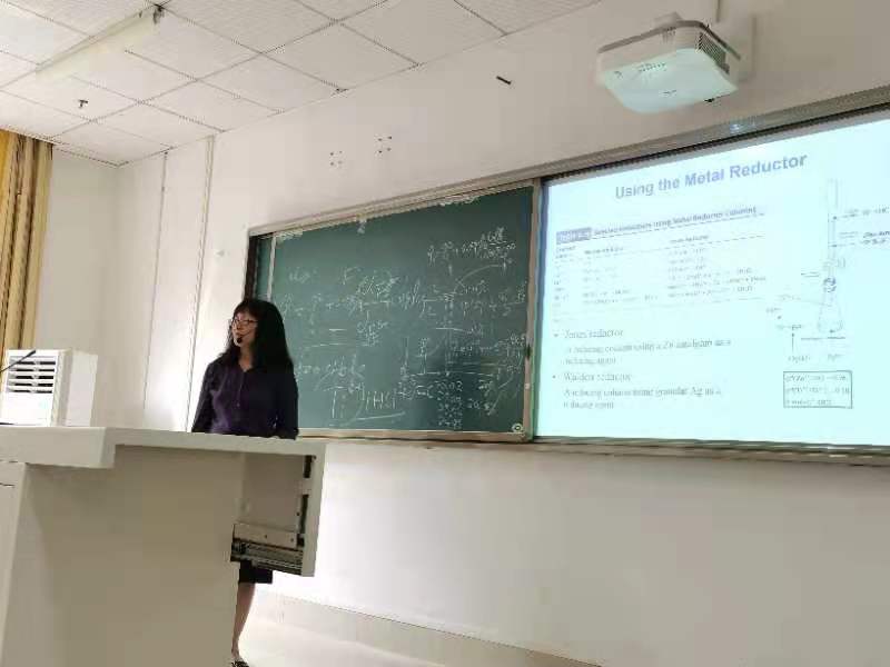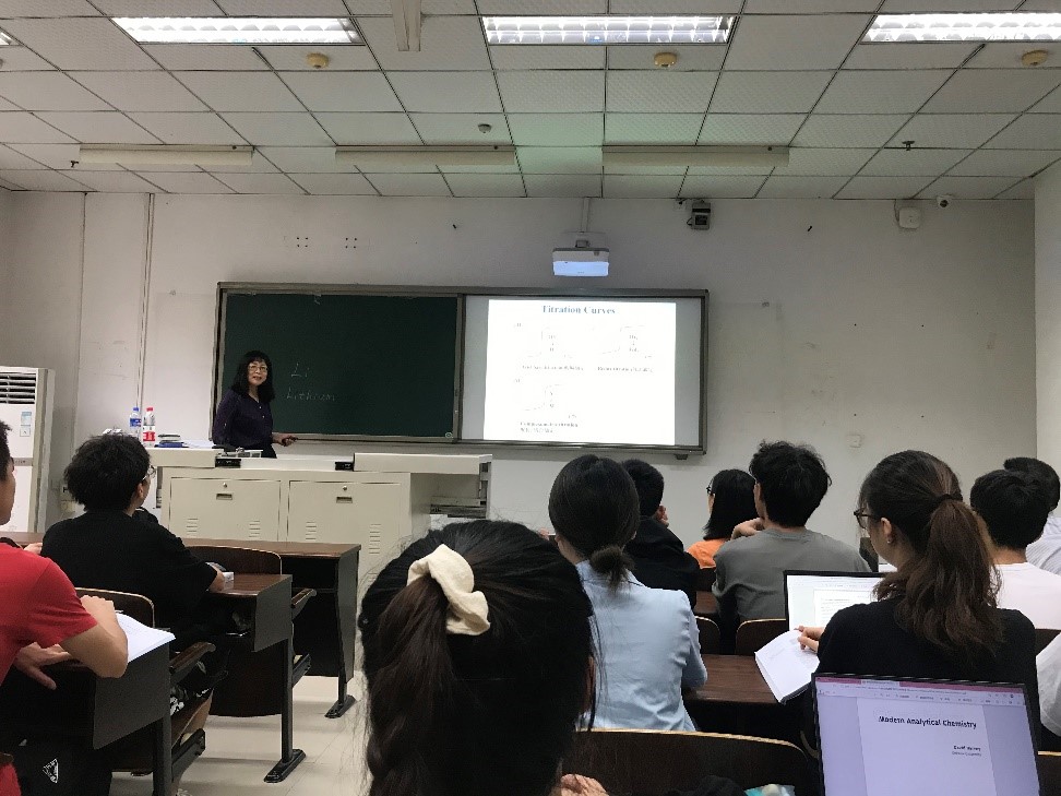 李娜教授毕业于北京大学并留校工作,在堪萨斯大学(美国)的HBC-CDDR做博士后1年,从事药物配伍与缓释研究工作。从事本科中英文教学近30年,主编著中英文教材3部,主持国家和省市教学和科研项目13项,以通讯作者发表教改论文和科学研究论文70余篇。她教学经验丰富,致力于科研促教学、促人才培养,多次以第一完成人获教育部、北京市教学奖励。李教授本次授课内容是《分析化学》课程里的氧化还原滴定和沉淀滴定。她从原电池的原理开始讲起,到沉淀滴定操作结束,内容丰富,图文并茂,信息量大。抑扬顿挫的英文表达、适宜的语速、幽默风趣的语言风格和深入浅出的授课技巧使生涩难懂的知识变得通俗易懂。上课期间她鼓励同学要敢于质疑,多思善问,同学们听得聚精会神,课堂气氛非常活跃。