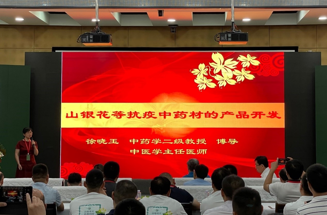 在本次会议的“中国山银花产业发展论坛”上,徐晓玉教授受邀作了题为“山银花等抗疫中药材的产品开发”的首场学术报告。报告总结了前期中医药抗疫的成果和经验,介绍了中药抗疫效果的学术作用机制,提出了挖掘有效的抗疫中药的思路,并对如何开发以山银花为代表的抗疫系列产品提出了建设性的意见。其针对性、适用性、可行性受到与会者的一致好评。