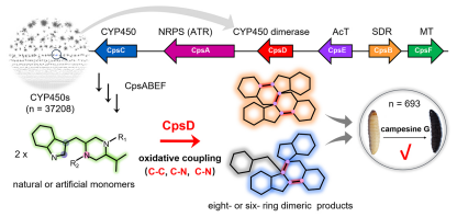 该研究获得以下主要结果:(1)系统分析了Pfam数据库中的37208个CYP450,通过序列相似性网络分析方法,发现了真菌中具有二聚化催化功能的CYP450分支,其中的一个CYP450(CpsD)连锁的基因簇中包含哌嗪类化合物合成所必须的单模块非核糖体肽合成酶(CpsA)和短链脱氢/还原酶(CpsB);(2)通过异源生物合成策略实现了该基因簇在模式菌株构巢曲霉中的表达,鉴定了一系列结构新颖的吲哚哌嗪类单体和二聚化产物,命名为campesines A-G;(3)通过单体底物的化学衍生策略,系统地研究了二聚化CYP450 CpsD的催化机理,并获得一系列人工衍生产物;(4)通过活性测试,发现campesine类化合物具有良好的抗大蜡螟活性,其中途径终产物campesine G的抗虫活性最佳。