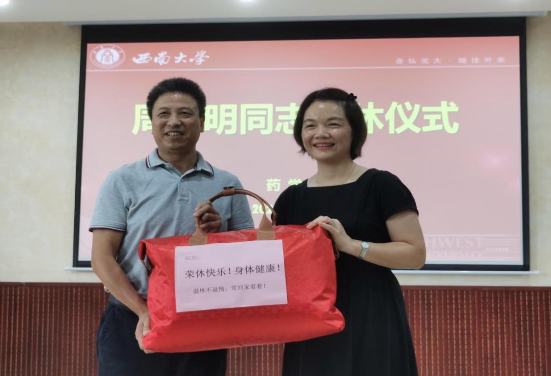 罗雷院长回顾了周大明同志到学院工作后的难忘点滴,充分肯定了周大明同志为学院事业作出的积极贡献,并送上美好祝愿,颁发了荣休纪念牌。罗红丽同志代表学院工会赠送了荣休纪念品。