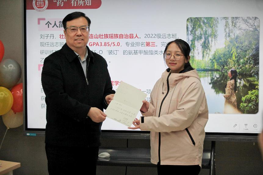活动中,王校长参与制作中药特色香囊,并为其所联系的少数民族学生刘子丹赠送寄语卡片,鼓励她心怀大爱,手执良药,以专业守护健康,以奋斗铸就未来。