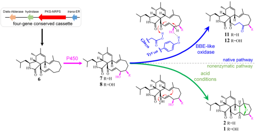 针对上述两大瓶颈问题,邹懿教授课题组以黄柄曲霉来源的aspochalasin类细胞松弛素作为研究对象进行了详细研究。通过异源生物合成,化合物喂养,酶生化表征,分子对接结合定点突变和同位素示踪标记等多学科交叉方法和策略,该课题组(1)成功鉴定了黄柄曲霉中负责aspochalasin类化合物合成的基因簇;(2)通过在模式真菌构巢曲霉中异源合成的方式,首次实现了四个核心骨架基因所负责的aspochalasin类化合物核心骨架的生成,并解析了aspochalasin类化合物的完整合成途径;(3)发现了多聚化和多环化类型的细胞松弛素类化合物可能为非酶催化产物(或其衍生物);(4)证实了一个新颖的BBE家族氧化酶,其催化了一个特殊的质子化驱动的双键异构化反应,并在aspochalasin类化合物合成中作为天然途径和非酶催化途径的关键转化开关。