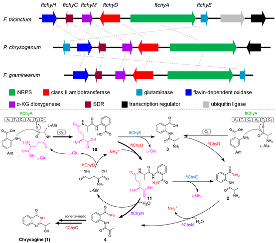 真菌来源的Chrysogine(1)作为最简单4(3H)-喹唑啉酮类天然产物,尽管其生物合成基因簇之前已在产黄青霉菌(P. chrysogenum)和禾谷镰刀菌(F. graminearum)中被相继鉴定,但是,关于该化合物详细的生物合成步骤和基因簇中各个酶的催化功能却未得到深入阐明。特别是双模块非核糖体多肽合成酶ChyA的功能与催化机制;结构中N-3位氮的来源和组装机制以及后续4(3H)-喹唑啉酮骨架的形成方式等重要科学问题亟需解决。