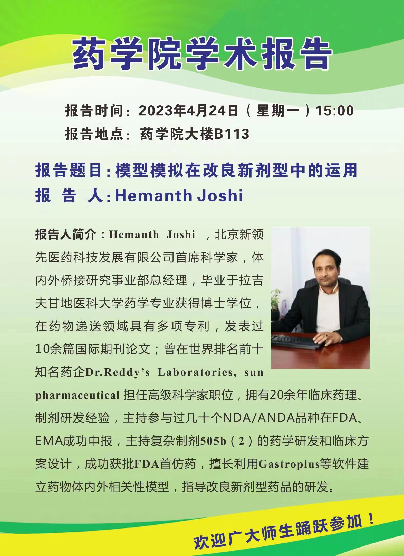 北京新领先医药科技发展有限公司首席科学家Hemanth Joshi作学术报告