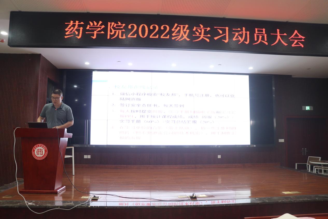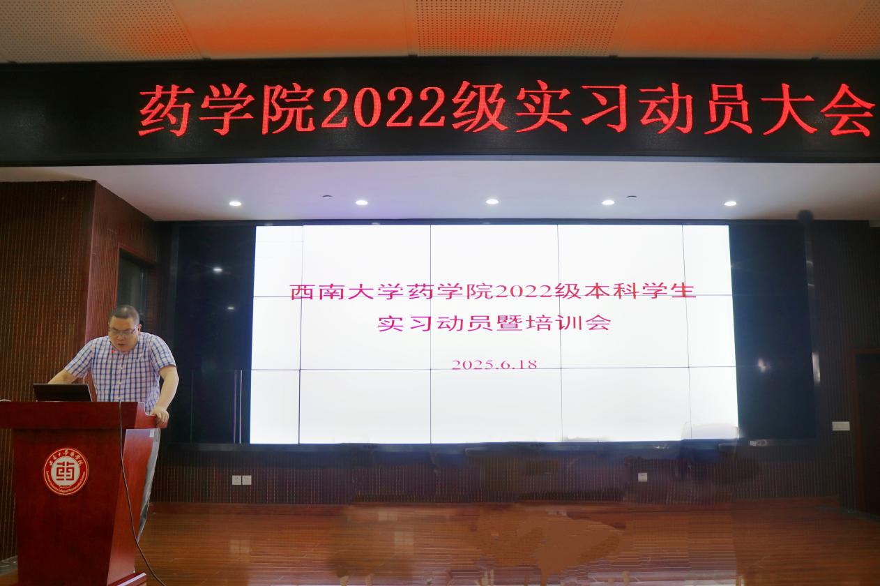 大会伊始,学院副院长张保顺发表实习动员讲话。首先他强调,实习绝非简单的课程延伸,而是大学学习生涯中至关重要的转折点,是将书本理论知识转化为实践能力的黄金契机。张保顺要求同学们以饱满的精神状态投入实习,对待每一项任务都要秉持严谨细致的态度,严格遵守实习单位的规章制度与操作规范。他着重指出,每一位药院学子在实习岗位上的表现,都代表着学院的形象,希望同学们用出色的专业表现,展现药院学子扎实的专业功底、良好的职业素养和积极进取的精神风貌,既为学院赢得荣誉,也为个人的职业发展积累宝贵经验。此外,张保顺还特别叮嘱同学们,务必将安全意识牢记心间,听从指导教师和企业导师的安排,保障自身安全。同时,要保持与学院的密切联系,定期汇报实习进展,及时沟通解决遇到的问题。