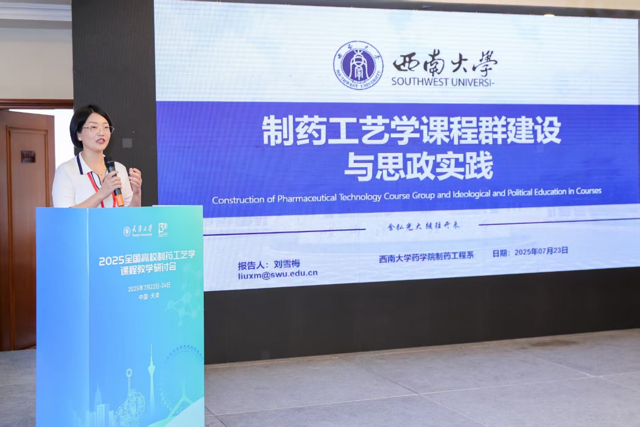 2025年7月22日至24日,由教育部高等学校药学类专业教学指导委员会主办,天津大学合成生物与生物制造学院承办的“2025年全国高校《制药工艺学》课程教学研讨会”在天津召开。本次研讨会紧扣国家“教育、科技、人才”三位一体发展战略,聚焦制药工艺学教学的关键问题,共同探讨人工智能时代人才培养的新理念、新思路和新范式,来自天津大学、华东理工大学、西北大学、中国药科大学、沈阳药科大学等全国50余所近百名专家和教师参加了此次教学研讨会。我院制药工程专业系主任刘雪梅教授受邀参会,并作题为《制药工艺学课程群建设与思政实践》的主旨报告,分享教学改革经验,引发与会专家热烈反响。